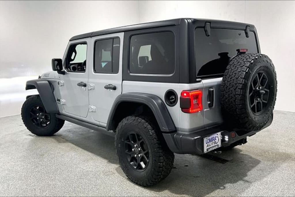 Silver Zynith Clearcoat 2024 Jeep Wrangler Willys 4WD 8-Speed Automatic 2.0L I4 DOHC STABILITY CONTROL, APPEARANCE PACKAGE, BLUETOOTH, HANDS-FREE, *CRUISE CONTROL*, *POWER LOCKS*, *POWER WINDOWS*, KEYLESS ENTRY, BACKUP CAMERA, PREMIUM AUDIO, PREMIUM AUDIO CONNECTION, PORTABLE AUDIO CONNECTION, Wrangler Willys, 2.0L I4 DOHC, 4WD, 2-Door Passive Entry, Front Door Locks, 240 Amp Alternator, 4-Wheel Drive Swing Gate Decal, 4.10 Rear Axle Ratio, 7 & 4 Pin Wiring Harness, 97 MPH Vehicle Max Speed Calibration, Advanced Brake Assist, Air Conditioning w/Auto Temperature Control, Air Filtering, Auto High Beam Headlamp Control, Automatic Headlamps, Auxiliary Switches, Black Grille, Blind Spot & Cross Path Detection, Class II Receiver Hitch, Cluster 7.0" TFT Color Display, Convenience Group, Conventional Differential Front Axle, Corning Gorilla Glass, Dana M210 Wide HD Tube Front Axle, Dana M220 Wide Rear Axle, Daytime Running Lamps LED Accents, Deep Tint Sunscreen Windows, E-Locker Rear Axle, Emergency/Assistance Call, Enhanced Adaptive Cruise Control, Front 1-Touch Down Power Windows, Front LED Fog Lamps, Full Speed Forward Collision Warning Plus, Heated Front Seats, Heated Steering Wheel, Injection Molded Black Rear Bumper, LED Premium Reflector Headlamps, LED Taillamps, Mold In Color Bumper w/Gloss Black, Molded in Color Rubicon Highline Flare, MOPAR All-Weather Floor Mats, Off-Road Plus Mode, ParkSense Rear Park Assist System, Power Heated Mirrors, Premium Wrapped Steering Wheel, Quick Order Package 22W Willys, Remote Keyless Entry, Remote Start System, Safety Group, Security Alarm, Speed Sensitive Power Locks, Sun Visors w/Illuminated Vanity Mirrors, Universal Garage Door Opener, Wheels: 17" x 7.5" Painted Black, Willy's Suspension, Willys, Willys Hood Decal.